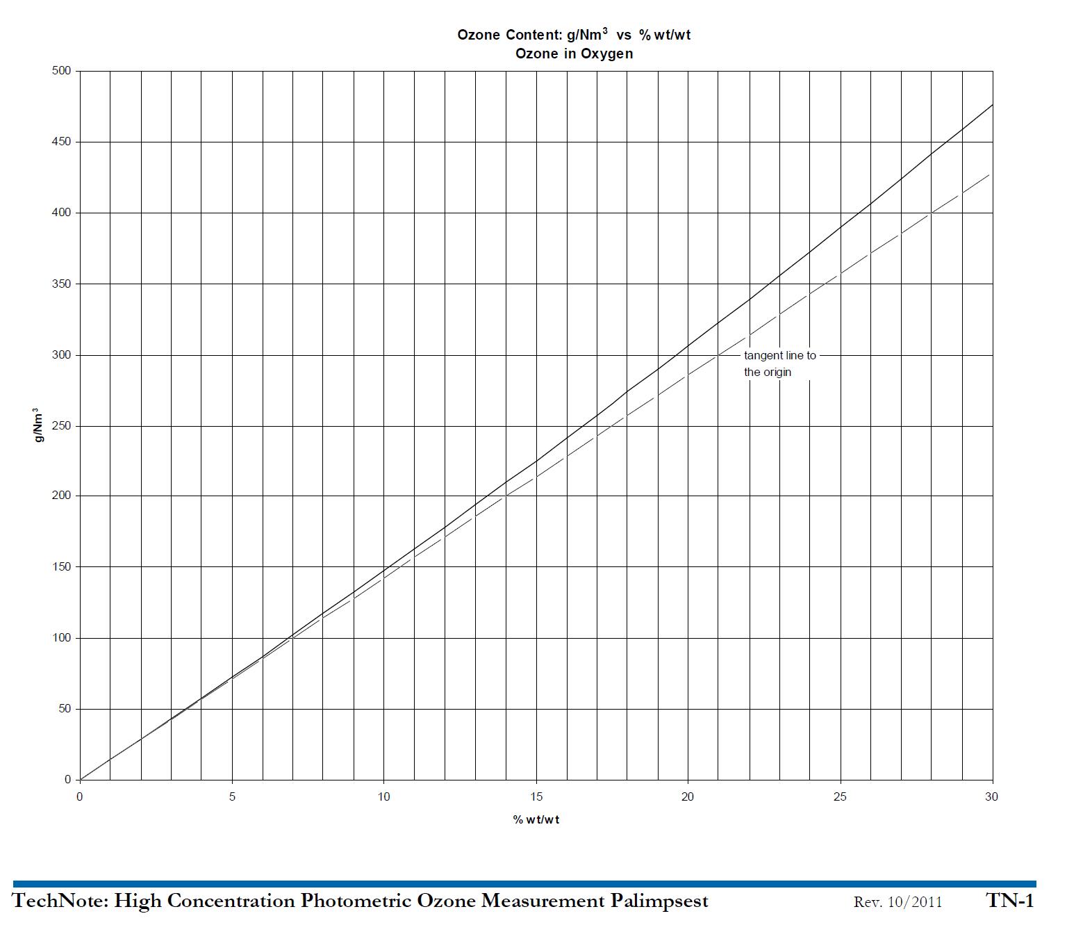 1 Nm3是在0℃和1 atm條件下每立方米所含的樣品氣體的質(zhì)量。這是一個(gè)重要的事實(shí),氣體混合物(臭氧和載氣)隨著臭氧含量的變化而改變密度,因?yàn)檠?一個(gè)氧分子有兩個(gè)原子)當(dāng)它轉(zhuǎn)化成臭氧(一個(gè)臭氧分子有三個(gè)原子)時(shí)“收縮”。在商g/Nm3中,分子分母都隨著臭氧含量的變化而變化,使得g/Nm3和% wt/wt之間的關(guān)系是非線性的!