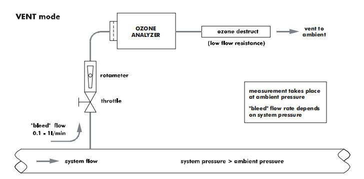 當系統低流速較高時,例如在每分鐘 1 到 10 升之間, 很好的解決方案是將臭氧分析儀旁路連接到臭氧管路中的小流阻。在這個流動阻力下的壓降應該在幾毫巴的數量級,以允許足夠的樣氣流過分析儀。